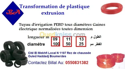 Transformation de plastique extrusion ..... Tuyau d'irrigation PEBD tous diamètres Gaines électrique normalisées toutes dimensions ..... La longueur et le diamètre sur demande ....