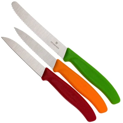 Cet ensemble de couteaux à légumes Victorinox SwissClassic contient un couteau à tomates vert 10 cm, un couteau à légumes rouge 8 cm et un couteau à légumes dentelé orange 8 cm. Cet