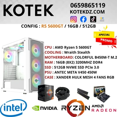 CPU : AMD Ryzen 5 5600GT COOLING : Wraith Stealth MOTHERBOARD: COLORFUL B450M-T M.2 RAM : 16GB (8X2) 3200MHZ DDR4 SSD : 512GB NVME SSD PCIe 3.0 PSU : ANTEC META V450 450W CASE : XANDER HUL