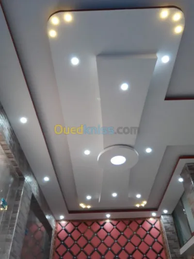 Tous les travaux plaque au platre : revêtement mural . Cloison avec ou sans la laine de verre . Fau plafon b 13 decoration en placo plus les plafond pvc et l'électricité qui concerne le p