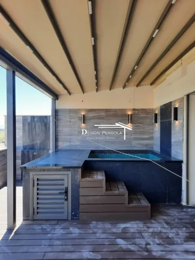 Pergola Bâche Rétractable Etanche , Electrique. Structure caractérisée par ses lignes, ou la toile forme de charmantes vagues, est fixé sur un système qui vient s’ajouter à la str