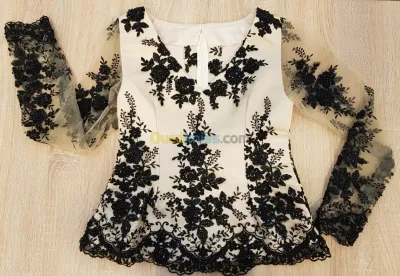 Ensemble jupe courte et haut beige avec dentelle perlée noire