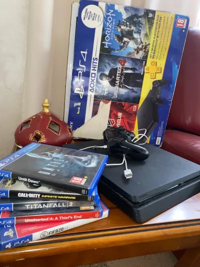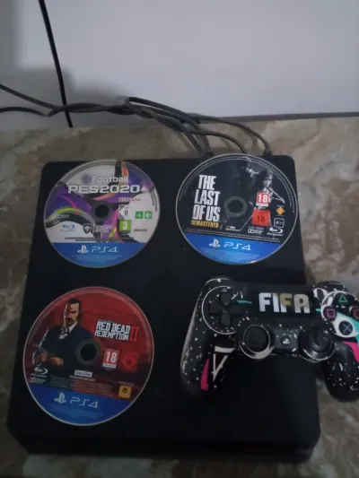 🎮 للبيع PlayStation 4 Slim - 500GB 🔹 الحالة: مستعمل (مش نظيف بزاف من الخارج)، لكن يخدم بلا مشاكل 🔹 غير مهكر 🔹 يج�