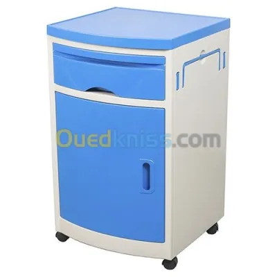 Table de chevet médicale XL-B01 en plastique ABS de haute qualité, légère, robuste et facile à déplacer grâce à ses roulettes. Équipée d’un tiroir, d’une porte de rangement et