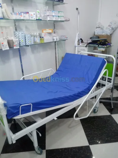 lit d'hôpital a 3 position en abs Fabriqué en tubes d’acier rectangulaire 30 × 60 mm et en tôle métallique, composé d’un dossier et relève jambres articulés par une manivelle mul