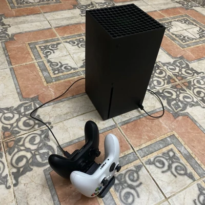 Xbox series X 1tb 8k 60fps très bon état. Manette blanche état neuf. Manette noire état normal. Support chargeur pour 2 manettes.