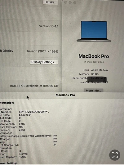 MACBOOK PRO M4 16 pouce êtas 10/10 cycle 13 batrry 100/100 512/24gb garantei 6 mois
