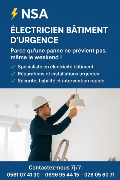 🔌 NSA – Électricien Bâtiment d’Urgence ⚡ Parce qu’une panne ne prévient pas, même le weekend ! ✅ Spécialiste en électricité bâtiment ✅ Réparations et installations u