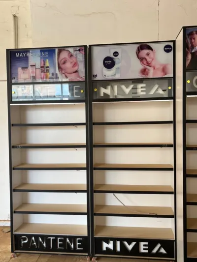 Bonsoir je vends un lot 3 étagères dans 2 avec bac Vitré 6 m et 4 m de longueur pour conserver les produits Et 1 avec le design des produits du miels 2 m de longueur