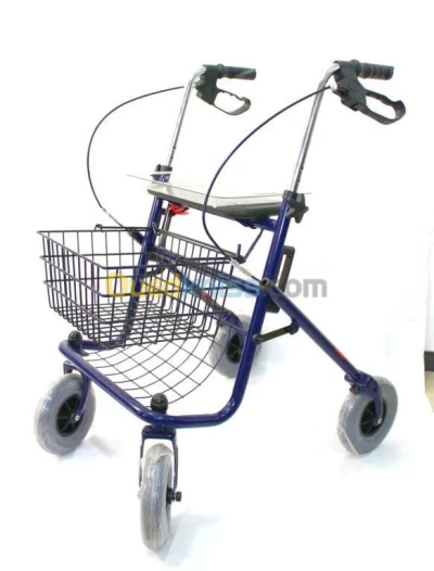 Rollator 4 roues pliant. Equipé d'un panier amovible de transport, d'une tablette-plateau plexi, d'une assise et d'un porte canne. Freins parking et poignées réglables en hauteur. Modèle