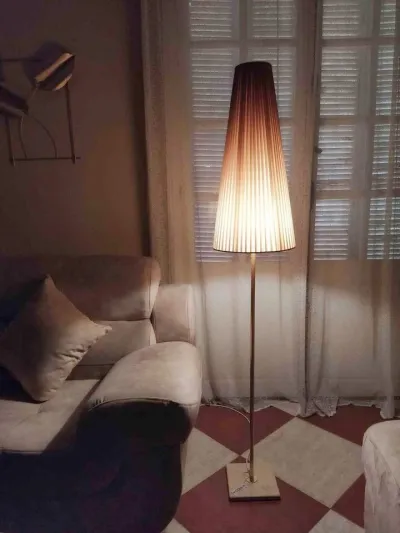 Lampadaire abat-jour pour salon hauteur 1m68cm socle en marbre pied doré chapeau en tissu marron clair.