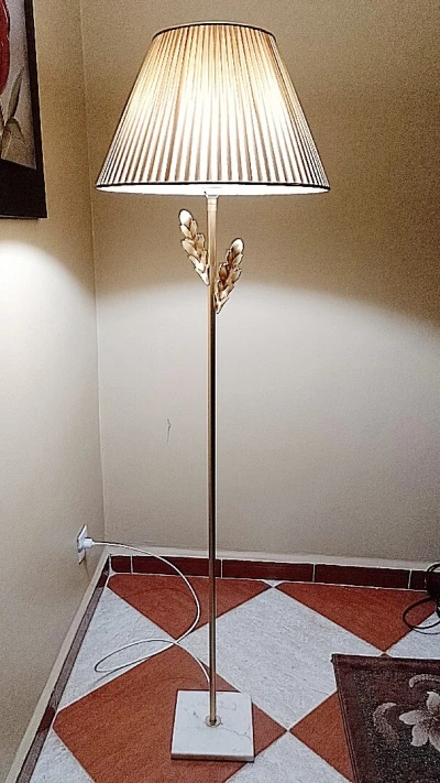 Lampadaire abat-jour pour salon, socle en marbre pied en métal doré, chapeau en tissu marron clair. Livraison disponible