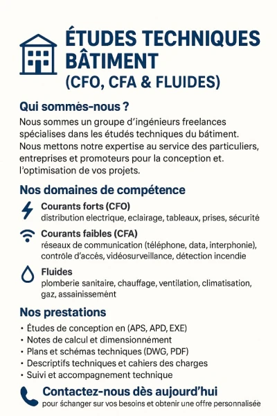 📢 Offre de service – Études techniques bâtiment (CFO, CFA & Fluides) 🔧 Qui sommes-nous ? Nous sommes un groupe d’ingénieurs en freelances spécialisés dans les études techniq