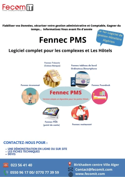 Promo moins de 5% sur tous nos logiciels. Fennec PMS est un système qui permet de gérer toutes les taches techniques et administratives de votre Hôtel, il fonctionne en full Web, avec une