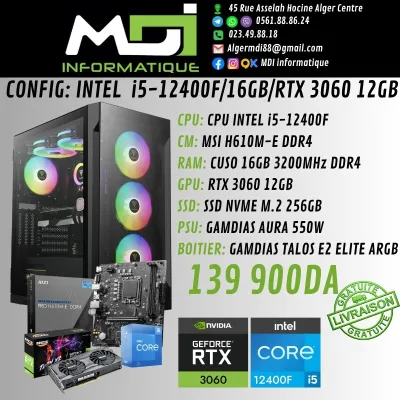 CPU: CPU INTEL i5-12400F CM: MSI H610M-E DDR4 RAM: CUSO 16GB 3200MHz DDR4 GPU: RTX 3060 12GB SSD: SSD NVME M.2 256GB PSU: GAMDIAS AURA 550W BOITIER: GAMDIAS TALOS E2 ELITE ARGB