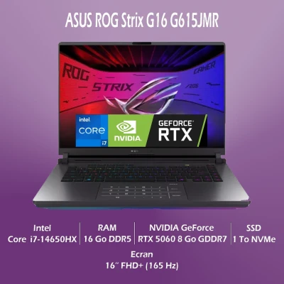 ASUS ROG STRIX 16 – Intel Core i7-14650HX | RTX 5060 8 Go | 16" WQXGA 165 Hz | 16 Go DDR5 | 1 To SSD NVMe | Windows 11 Original L’ASUS ROG Strix 16 est une machine de haute performance