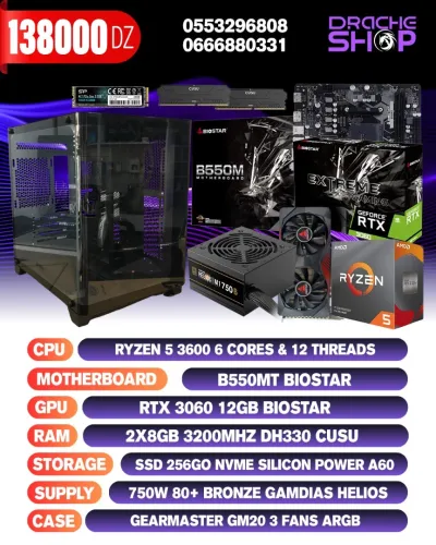 About this item: Cpu: Ryzen 5 3600 Motherboard: B550m T Biostar Gpu: RTX 3060 12GB Biostar Rams: 2*8GB 3200Mhz DH330 Cusu Storage: SSD 256GB Nvme Silicon Power A60 Psu: Gamdias Helios 750w 8