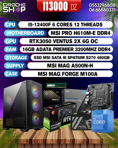 About this item: Cpu: Intel I5 12400F Motherboard: H610m E MSI Gpu: RTX 3050 6GB MSI Ventus 2X Rams: 16GB 3200Mhz Adata Storage: SSD 480GB MSI Spatium Psu: MSI Mag A500-NH 500w Case: MSI Ma
