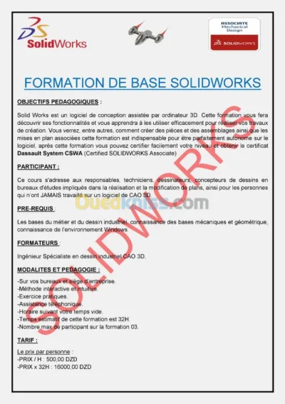 FORMATION DE BASE SOLIDWORKS OBJECTIFS PEDAGOGIQUES : Solid Works est un logiciel de conception assistée par ordinateur 3D. Cette formation vous fera découvrir ses fonctionnalités et v
