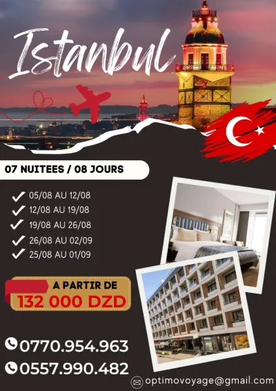 Voyage Organisé ISTANBUL OPTIMO TRAVEL vous propose un voyage organisé à ISTANBUL 8 Jours 7 Nuitées Inclus dans le programme: Billet d’avion aller-retour avec Turkis