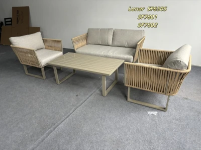 Salon de jardin 4 places en 100% Aluminium. Coussins anti-tache imperméable Le dessus de la table est en verre trompé Livraison disponible