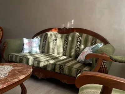 Salon rustique en bois hêtre, de 5 places. En moyen état. Table en bois et dessus en verre. صالون من خشب الزان، يتسع لـ 5 أشخاص. بحالة متوسطة. مع �