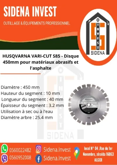 Disque diamant asphalte, béton frais ELITE CUT S85 - Ø 450 mm - HUSQVARNA Caractéristiques techniques Diamètre Ø 450 mm Configuration disque Segments Hauteur du segment 12 mm Longueur d