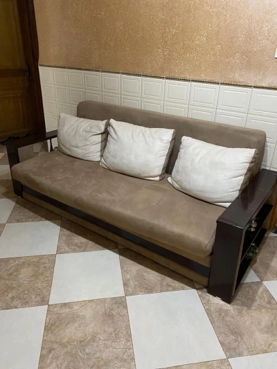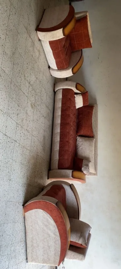 Ensemble de housses et coussins : 2 housses de canapé accompagnées de 6 coussins, couleur beige, en très bon état et bien entretenus. Prix : 6000 DA Rideaux blancs : 2 rideaux de couleur