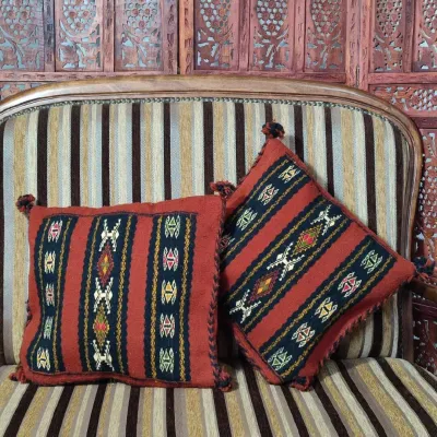 Paire de Coussins tissés à la main pure laine de mouton. Motifs originaux d'inspiration mozabite recto-verso. Authentique et très original