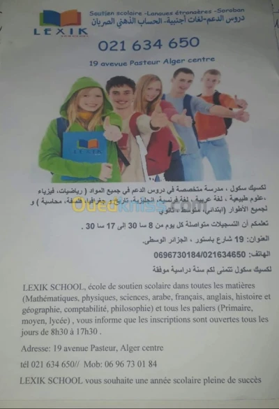 LEXIK école vous propose des cours de soutiens scolaires tout les niveaux - primaires,CEM,Lycée- MATH.. PHISQUE.. ARABE... FRANÇAIS... ANGLAIS.. SCIENCE...HISTOIRE GEO...PHILOSOPHIE...