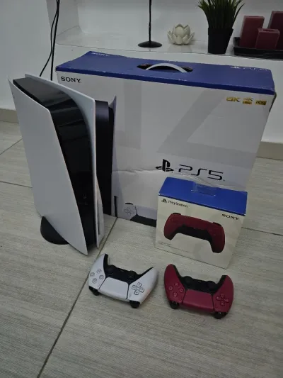 Salam, je vends une ps5 disc édition version 1200A en très bon état, avec sa boîte plus un compte qui contient fc 24 et d'autres jeux, plus deux manettes originales