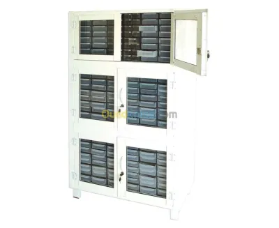 ARMOIRE PHARMACEUTIQUE MDT Fabriqué en tôle métallique, composée de six (06) portes vitrés en aluminium, avec de petits tiroirs en plastique et serrure à clé. Peinture «époxy».
