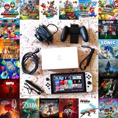Nintendo switch oled flashé + joycons édition mario -État d'écran 10/10 avec incassable -Touts les accessoires inclus dock tv chargeur support manette et les bracelets joycons Marche p