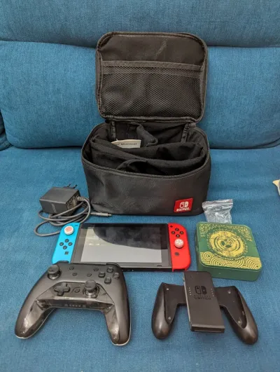 Switch V2 2019 Flashé avec jeux + Carte SD 128GB + Valise d'origine + Dock TV avec prise réseau+3 ports USB 3.0 + Support manette d'origine pour joycons + Manette originale très très
