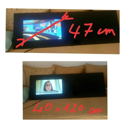 Vitre de verre fumée de dimension 120x40 cm et de 05 mm d'epaisseur integrant en son dessous une TV numerique de 47 cm ...le tout pouvant être soit mural soit servir sur support horizontal