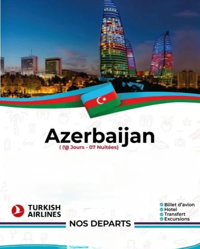 Voyage organisé Azarbaidjan Combiné Baku - Gabala Séjour de 08 jours et 07 nuits -Billet d’avion aller-retour avec Turkish Airlines -Transfert : Aéroport – Hôtel - Aéroport