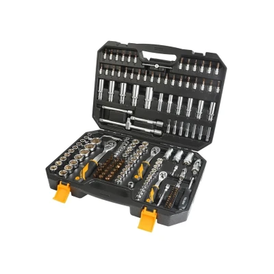 Caisse d'outils 216 piéces 15147 • Contient : 3 cliquets réversibles : 1/4″, 3/8″, 1/2″, 72T 12 clés mixtes CrV : 8, 10, 11, 12, 13, 14, 15, 16, 17, 18, 19, 22 mm 15 douilles Cr
