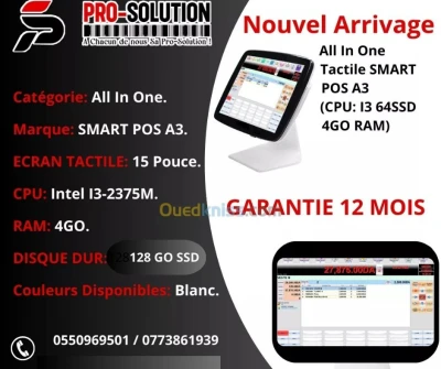 Nouvel Arrivage All In one SMART POS A3 Catégorie : All In One Marque : SMART POS ECRAN TACTILE 15 Pouce Pc point de vente a Ecran Tactile ALL IN ONE SMART POS A3 BLANC / Noir 04 Go RAM CP