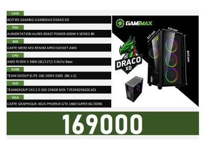 UNITE DRACO XD RYZEN 5 3600 16G DDR4 256G SSD 1660 SUPER BOITIER GAMING GAMEMAX DRAKO XD ALIMENTATION AURES BEAST POWER 600W X SERIES 80 CARTE MERE MSI B550M APRO SOCKET AM4 AMD RYZEN 5 3600