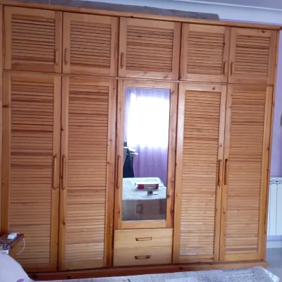 Armoire 10 portes,avec porte du milieu avec miroire et 2 tiroires,couleur bois nature,porte style persiennes. En très bon état, je la vend pour déménagement. Urgent