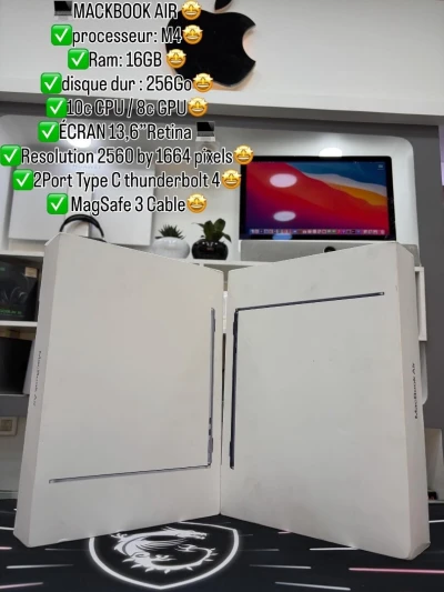 💻MACKBOOK AIR 🤩 ✅processeur: M4🤩 ✅Ram: 16GB 🤩 ✅disque dur : 256Go🤩 ✅10c CPU / 8c GPU🤩 ✅ÉCRAN 13,6”Retina 💻 ✅Resolution 2560 by 1664 pixels🤩 ✅2Port Ty