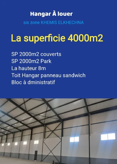 Bureau d'affaire met en location un hangar sis KHEMIS EL KHECHNA SP 2000m2 couverts et 2000m2 Park la hauteur 8m Hangar panneau sandwich bloc à dministratif