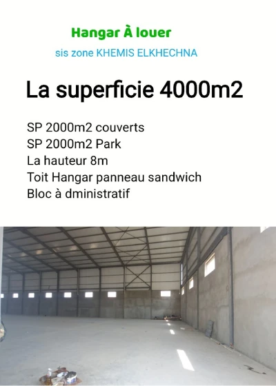 bureau d'affaire ASYAD met en location un hangar sis zone industrielle KHEMIS ELKHECHNA SP 2000m2 couverts et 2000m2 Park La hauteur 8m Toit Hangar panneau sandwich Bloc à dministratif