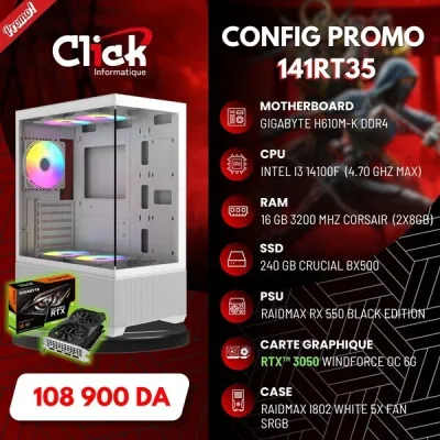 *CPU Intel Core I3-14100F *CARTE MERE H610M K *MEMOIRE UDIMM DDR4 16GO *SSD 240GB *ALIMENTATION 550W *CARTE GRAPHIQUE RTX 3050 WINDFORCE *BOITIER GAMER I802 RAIDMAX BLACK