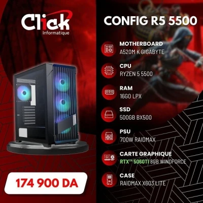 *CPU RYZEN 5 5500 *CARTE MERE A520M K GIGABYTE *MEMOIRE UDIMM DDR4 16GO LPX * SSD 500GO BX500 *CARTE GRAPHIQUE RTX 5060TI 8G WINDFORCE *ALIMENTAION RX700W *BOITIER GAMER X603 LITE