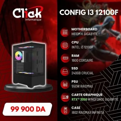 *CPU Intel Core i3-12100F (3.3 GHz / 4.3 GHz) *CARTE MERE GIGABYTE H610M K MICRO ATX *MEMOIRE UDIMM DDR4 16GO (08GOx2) 3200MHZ CORSAIR *SSD 0240GO CRUCIAL BX500 *ALIMENTATION RAIDMAX R