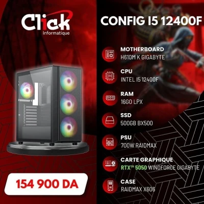 *CPU INTEL I5 12400F *CARTE MERE H610M K GIGABYTE *MEMOIRE UDIMM DDR4 16GO LPX * SSD 500GO BX500 *CARTE GRAPHIQUE RTX 5050 WINDFORCE *ALIMENTAION RX700W *BOITIER GAMER X606