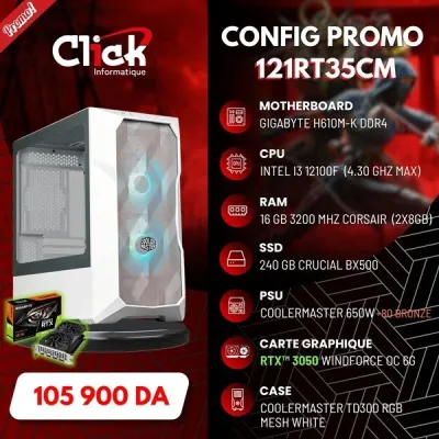 *CPU Intel Core i3-12100F (3.3 GHz / 4.3 GHz) *CARTE MERE GIGABYTE H610M K MICRO ATX *MEMOIRE UDIMM DDR4 16GO (08GOx2) 3200MHZ CORSAIR *SSD 0240GO CRUCIAL BX500 *ALIMENTATION COOLER MAS