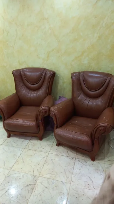 للبيع طقم صالون فاخر مكوّن من: أريكة بثلاثة مقاعد كرسيين فرديين مريحين اللون: بني داكن الخامة: جلد طبيع�