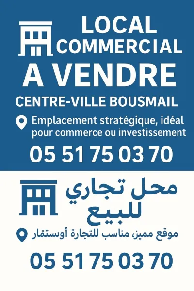 À vendre – Terrain commercial 100 % – Centre Bousmail L’agence Djamel Logistique propose à la vente un terrain 100 % commercial,deux façade idéal pour une promotion immobilière,
